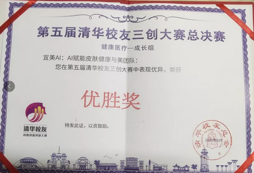2020年8月14日, 第五届清华校友三创大赛健康医疗全球总决赛在天津市武清区举行,宜远智能的“宜美AI:AI赋能皮肤健康与美”项目荣获成长组优胜奖。